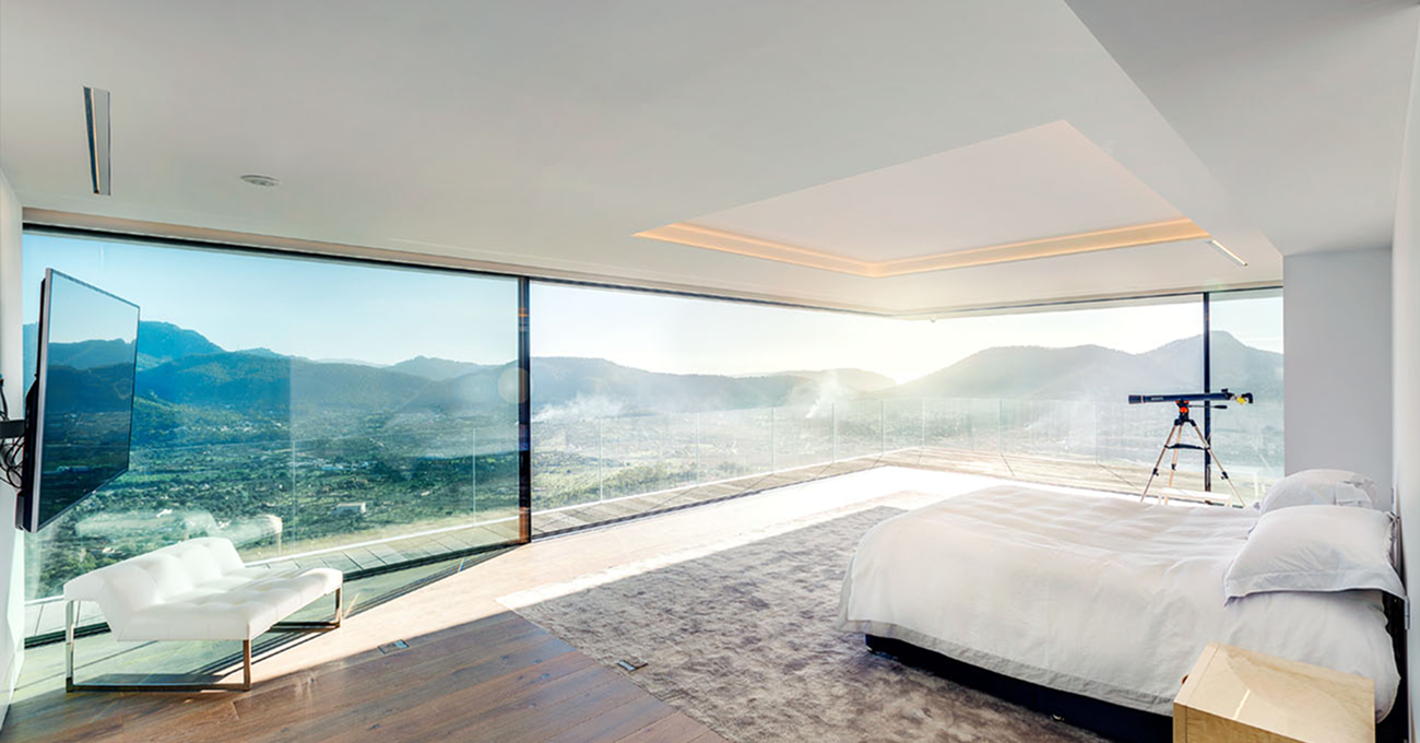 La planta baja alberga la zona de día, con salón-comedor, cocina abierta y sala de televisión, protegida del sol mediterráneo mediante grandes voladizos. En la planta primera, conocida como “el águila”, se ubican los dormitorios, todos con terrazas privadas. El dormitorio principal, situado en esquina y totalmente practicable, potencia la sensación de suspensión y ligereza.