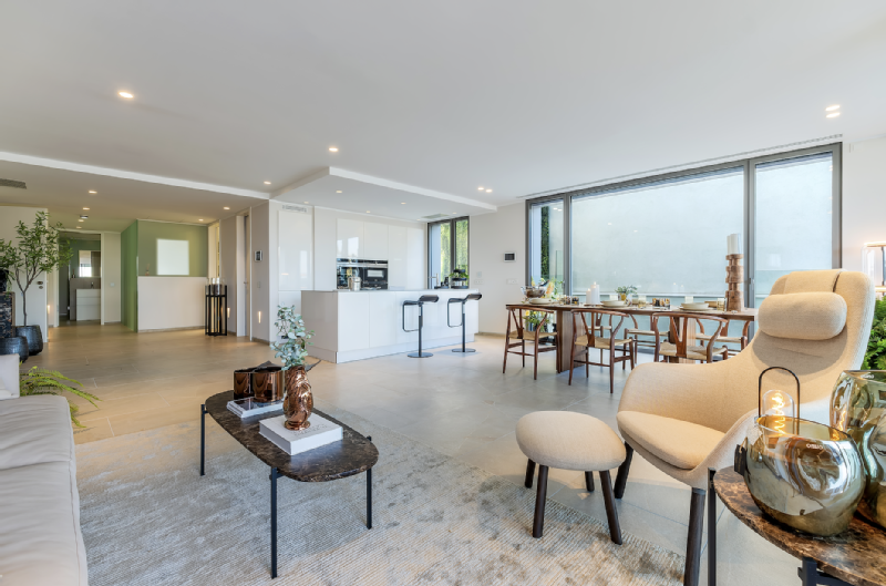 Los exteriores combinan mármol gris Balear, gres porcelánico y madera de iroko, junto con barandillas de vidrio, carpintería exterior de aluminio, persianas y tragaluces motorizados de vidrio y acero inoxidable. Las viviendas disponen de aire acondicionado por conductos, calefacción por suelo radiante y equipamiento completo de Spa, asegurando confort térmico y bienestar durante todo el año.