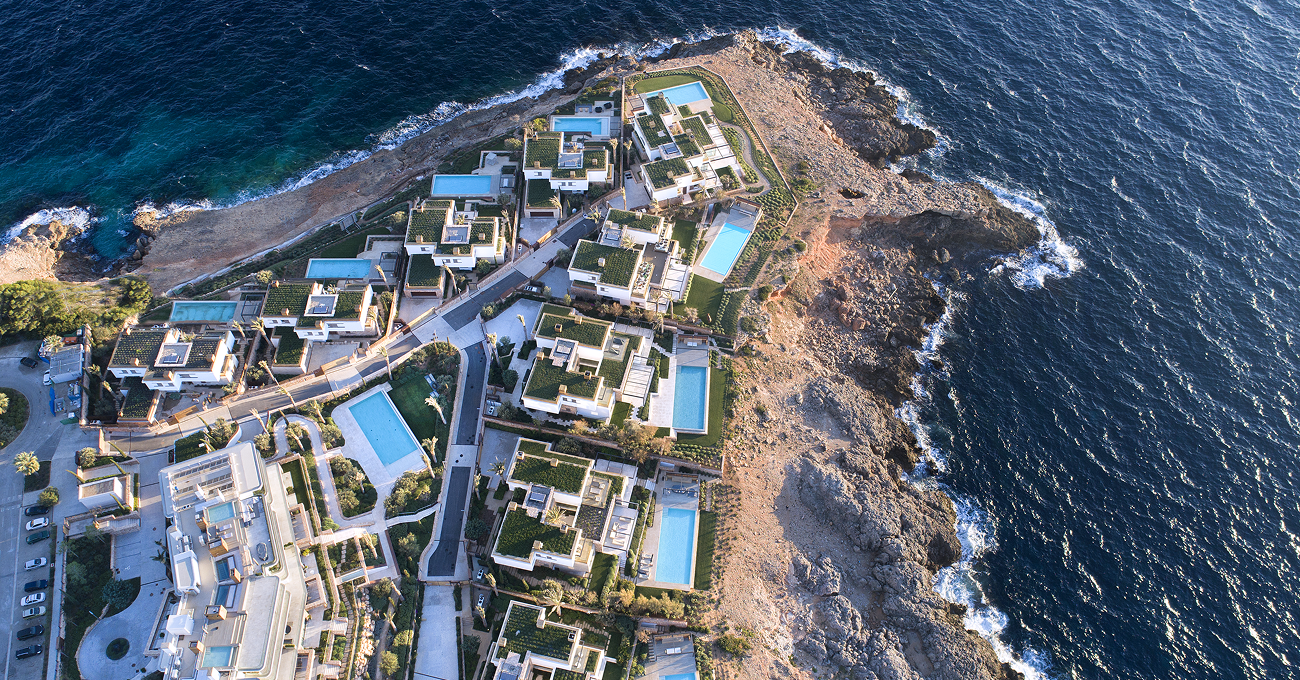 Los techos verdes de las villas desempeñan un papel clave en la percepción del conjunto. Desde las viviendas superiores, las vistas se proyectan sobre un manto vegetal continuo en lugar de cubiertas construidas, integrando arquitectura y naturaleza en una transición fluida hacia el Mediterráneo.