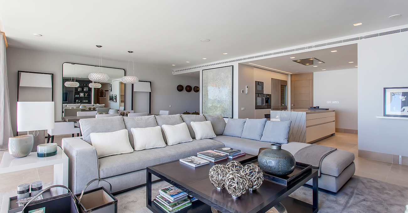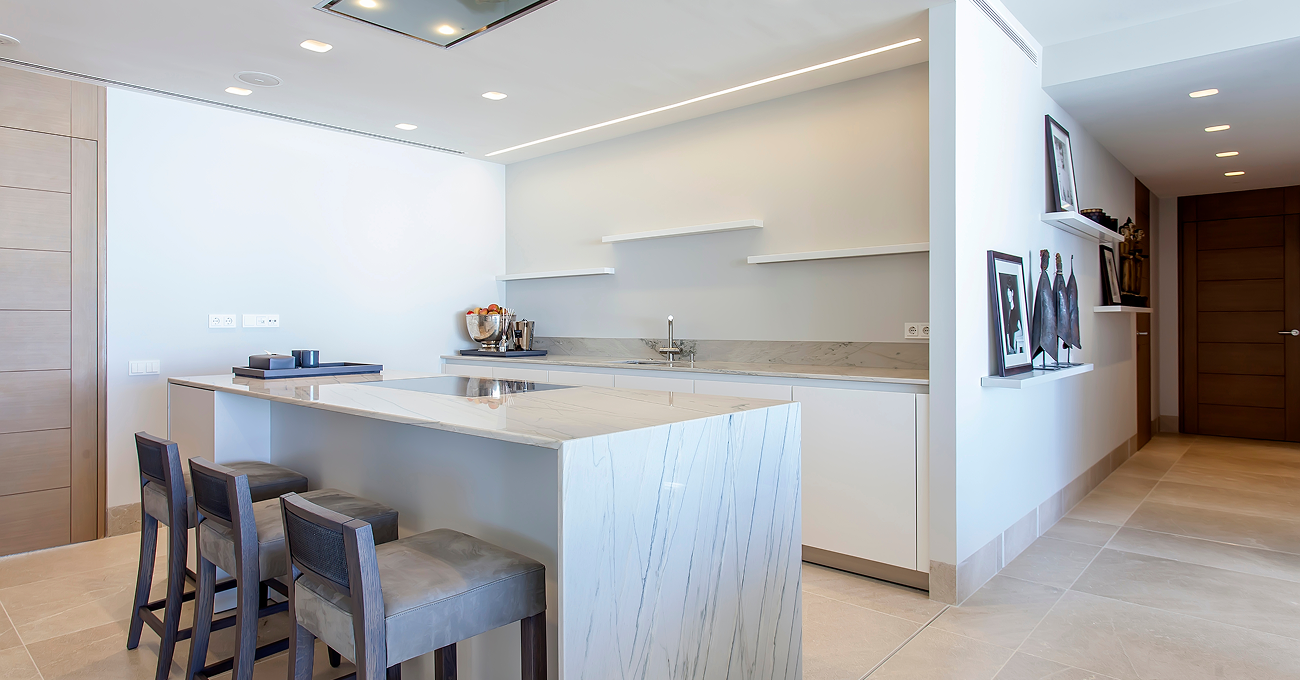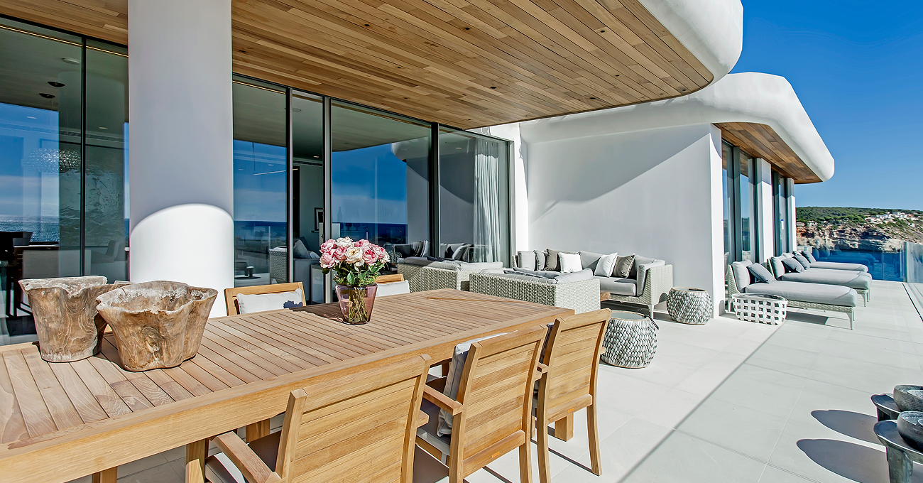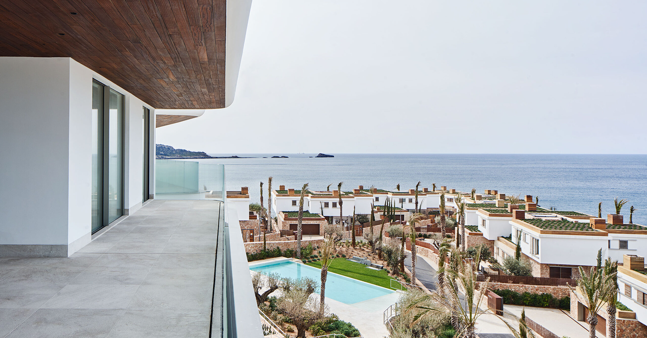 Las amplias terrazas blancas, concebidas como planos flotantes, evocan el movimiento de las olas y amplían significativamente el espacio habitable. Estas superficies exteriores refuerzan la continuidad entre interior y exterior, potenciando las vistas panorámicas y la experiencia mediterránea en cada vivienda.