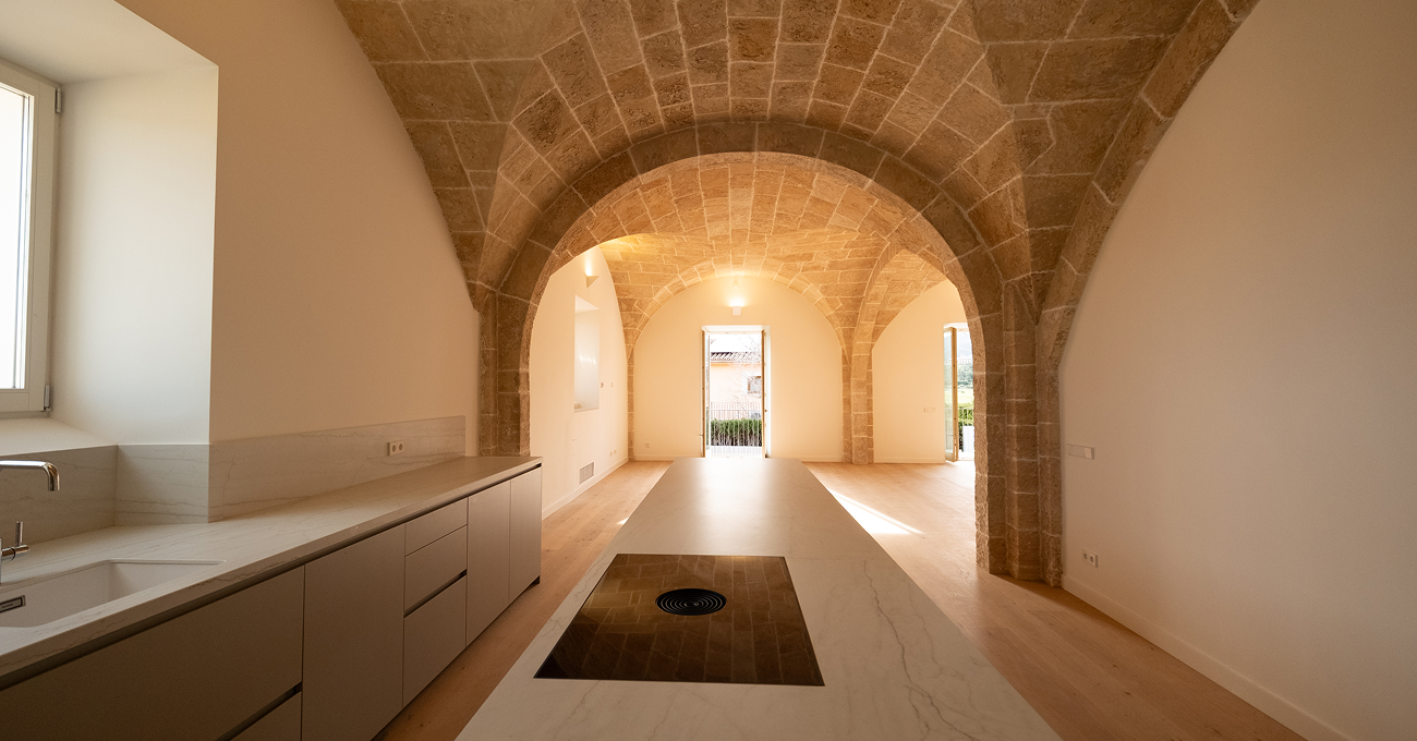 La intervención ha exigido un trabajo minucioso de conservación y restauración de los elementos característicos de la posesión original: muros de tapial, fachada histórica, torre defensiva, logia tradicional y antigua tafona. La planta cuadrada organizada alrededor de una clastra central, corazón arquitectónico de las posesiones mallorquinas, se ha mantenido como elemento estructurador del proyecto, preservando la esencia espacial original. Nuestro equipo ha ejecutado la rehabilitación con un enfoque técnico riguroso, consolidando estructuras centenarias y adaptando el edificio a los estándares actuales de confort, eficiencia y seguridad, sin alterar su identidad arquitectónica.
