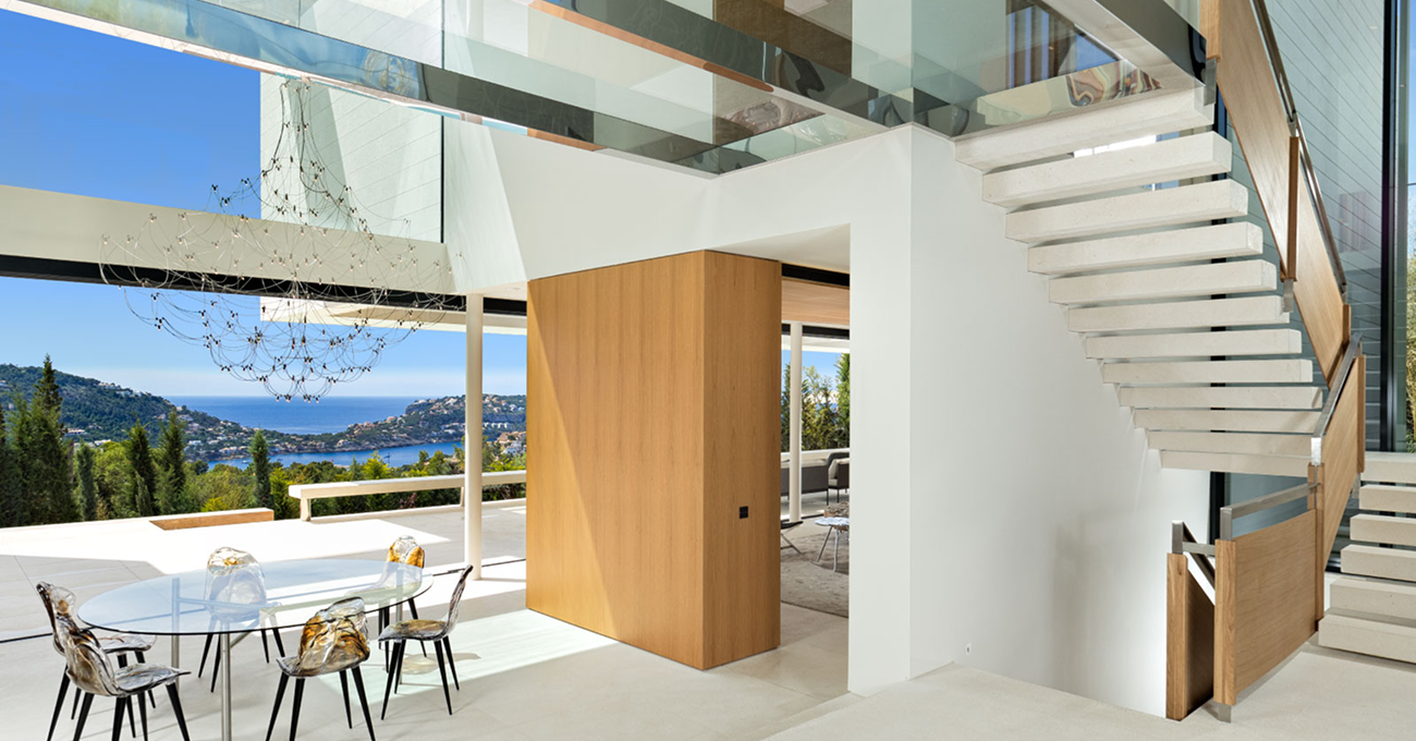 La vivienda se concibe como un volumen limpio y horizontal que se abre completamente hacia el exterior mediante grandes superficies acristaladas y muros cortina, potenciando la entrada de luz natural y la conexión con el entorno natural de Monport. Las terrazas amplias y la piscina longitudinal refuerzan la relación interior-exterior, generando espacios continuos pensados para disfrutar del clima mediterráneo durante todo el año. La integración de forjados vidriados y escaleras metálicas voladas aporta ligereza visual y carácter arquitectónico.