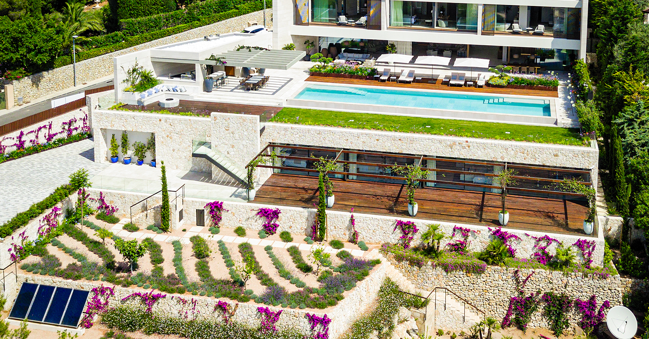 La villa se adapta a la topografía mediante una implantación escalonada que reduce el impacto visual y favorece la integración con el entorno natural. Los muros de piedra natural y los bancales ajardinados evocan la tradición constructiva mallorquina, mientras que los volúmenes blancos y las líneas horizontales aportan una imagen contemporánea y sofisticada. La piscina infinity, orientada hacia el paisaje de Port d’Andratx, se convierte en el eje central del proyecto, generando una continuidad visual directa con el Mediterráneo.