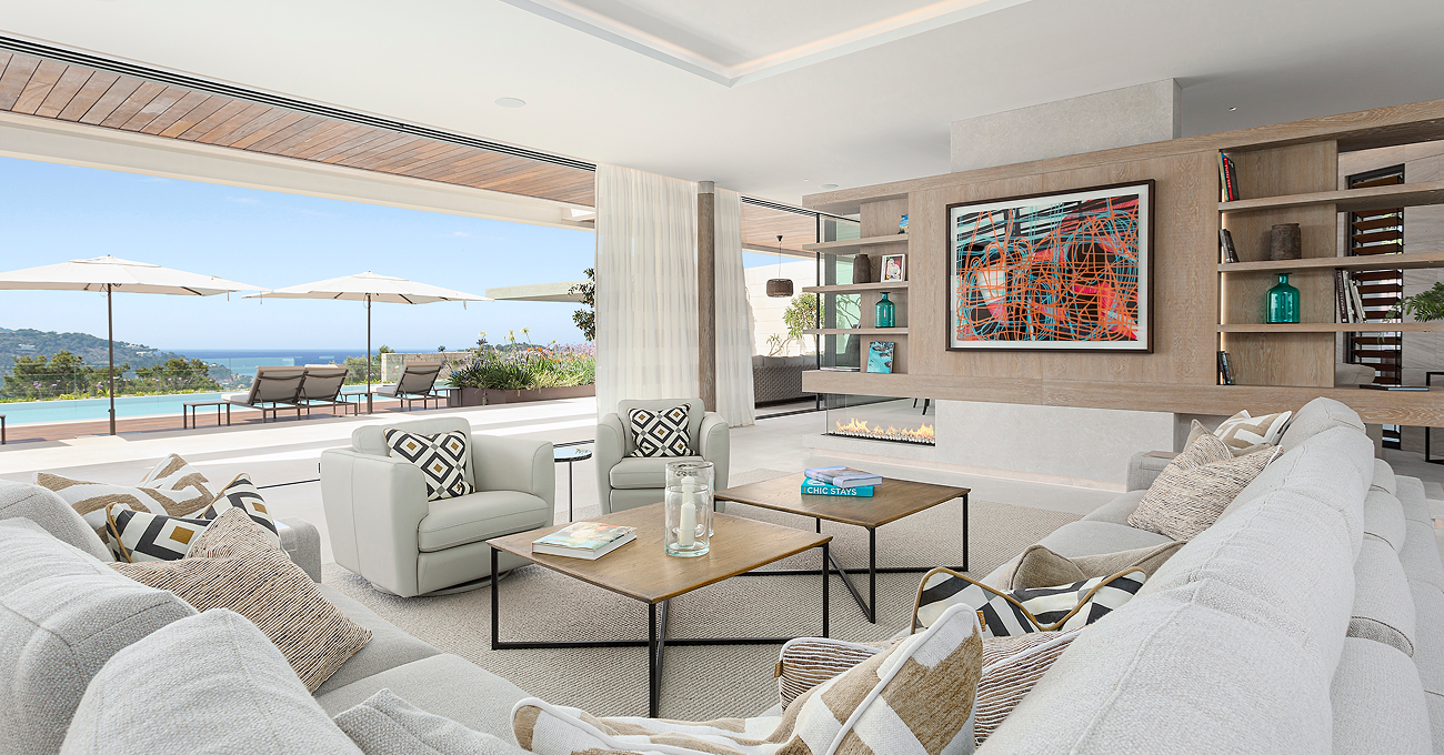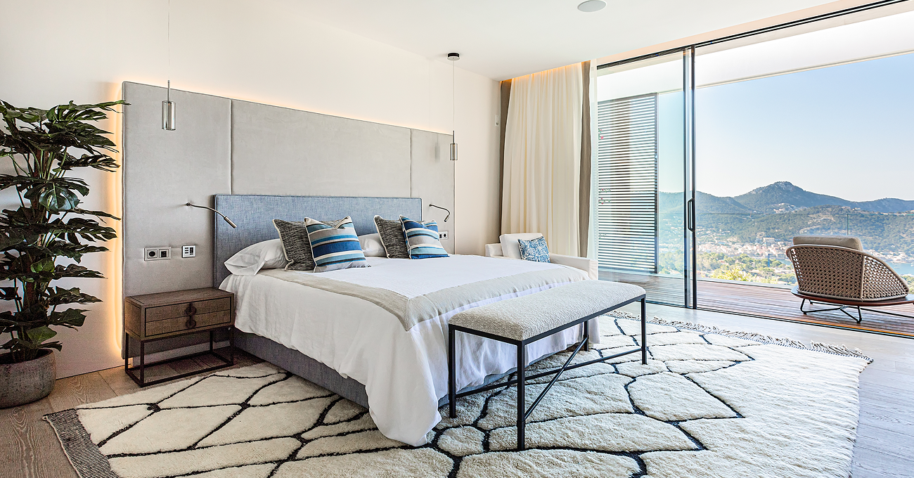 La vivienda se organiza para maximizar las vistas y la entrada de luz natural. Las grandes superficies acristaladas y las carpinterías de altas prestaciones permiten una transición fluida entre salón, comedor y terrazas exteriores. Las zonas de día se abren completamente hacia la piscina y el jardín, creando un espacio continuo pensado para el estilo de vida mediterráneo. Las terrazas cubiertas, las áreas de relax y el comedor exterior consolidan una experiencia residencial orientada al disfrute del clima de Mallorca durante todo el año.