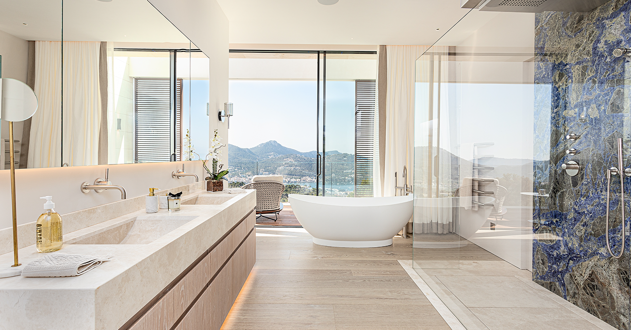 La selección de materiales responde a criterios de durabilidad, elegancia y coherencia con el entorno. Piedra natural en fachadas y muros de contención, revestimientos de gran formato y carpinterías minimalistas refuerzan la identidad arquitectónica del conjunto. La ejecución técnica y el cuidado por el detalle consolidan esta propiedad como una referencia en la construcción de villas exclusivas en Port d’Andratx, donde diseño, ingeniería y precisión constructiva se alinean con los estándares más exigentes del mercado residencial de lujo en Mallorca.