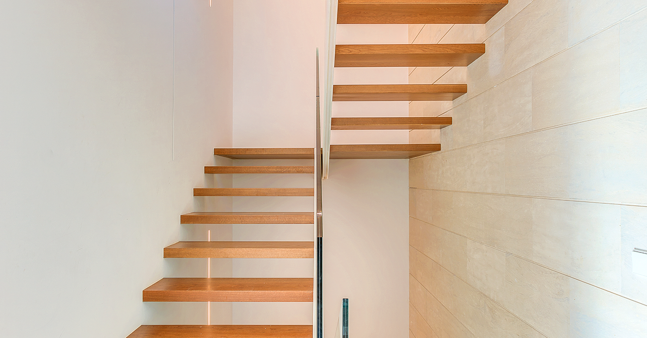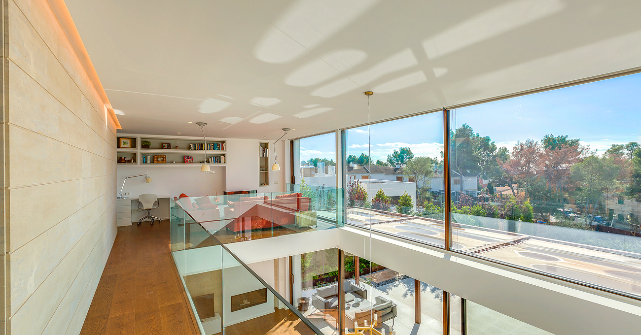 La selección de materiales responde a criterios de durabilidad, estética y confort: pavimentos interiores en piedra gris Zarci de 80x80 cm, abujardada y cepillada, carpintería Schüco Serie 7 con perfilería oculta y acabado en roble teñido, optimizando eficiencia energética y superficie acristalada. Chimenea de leña de doble cara como elemento central del espacio. Escalera metálica volada y barandillas de cristal laminado, aportando ligereza visual. Sistema de suelo radiante y climatización por zonas, garantizando máximo confort durante todo el año. En el exterior, los aplacados en piedra Beige Alicante escarificada colocada a rompe-junta aportan textura y carácter mediterráneo, mientras que el forro de fachadas y jardineras en piedra gris Zarci sobre plots y madera laminada de iroko refuerzan la continuidad estética y la resistencia al entorno marino. Las pérgolas de madera y acero crean espacios intermedios que permiten disfrutar del clima de Calvià en cualquier estación.