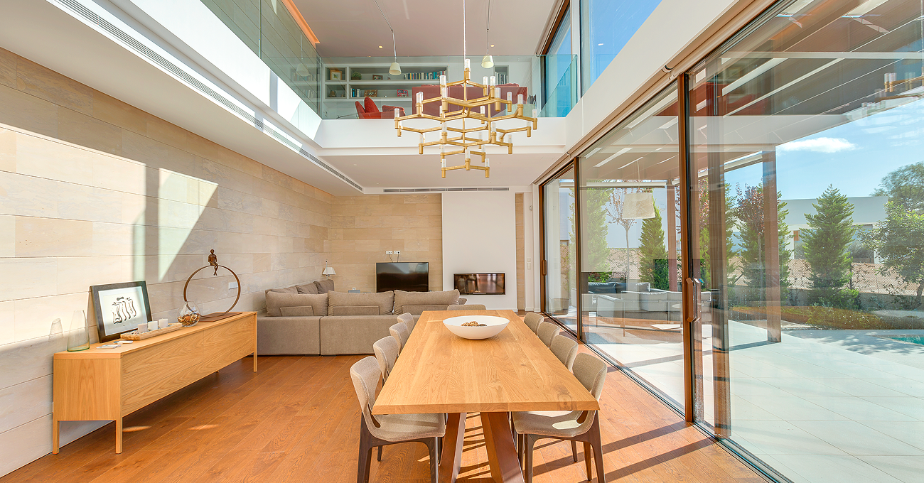 El cliente buscaba una vivienda luminosa, sofisticada y abierta, donde los espacios interiores dialogaran de forma continua con el jardín y la piscina. La arquitectura responde con: Grandes superficies acristaladas que maximizan la entrada de luz natural, carpinterías minimalistas que eliminan barreras visuales y espacios diáfanos en la zona de día, potenciando amplitud y fluidez. Integración total entre salón, comedor, porches y zona de piscina. El resultado es una villa de lujo en Portals Nous donde el Mediterráneo forma parte de la experiencia diaria.
