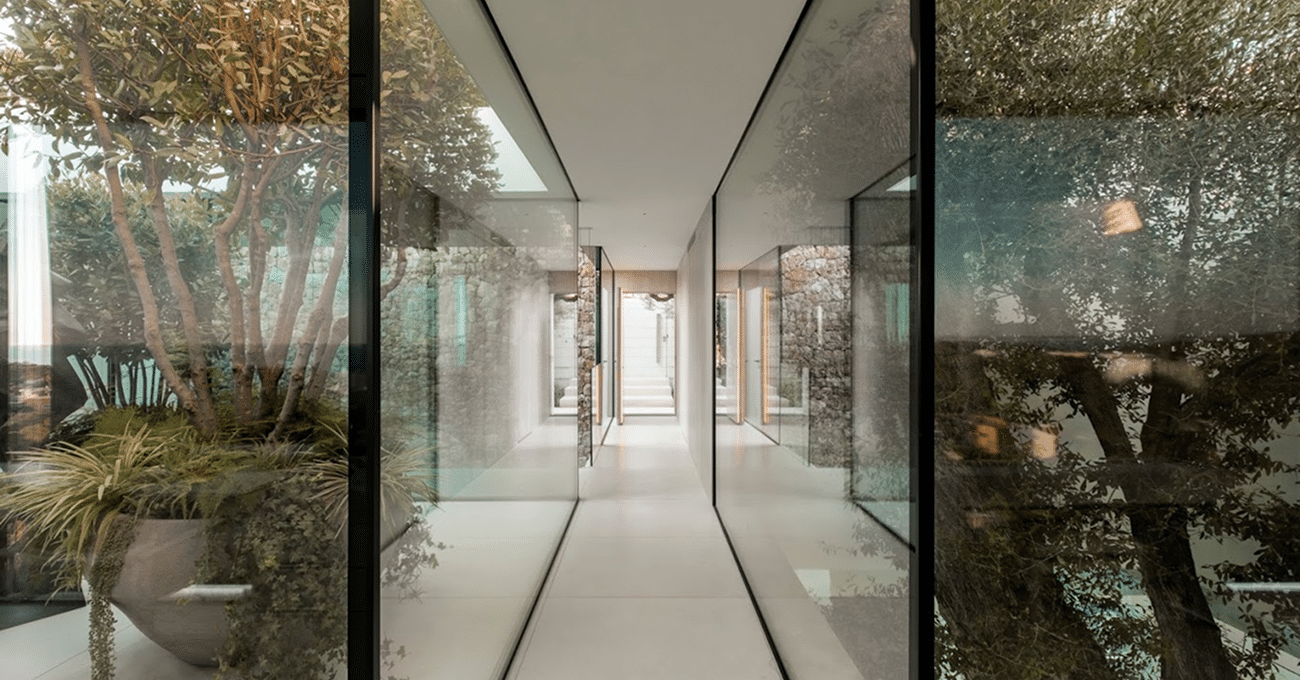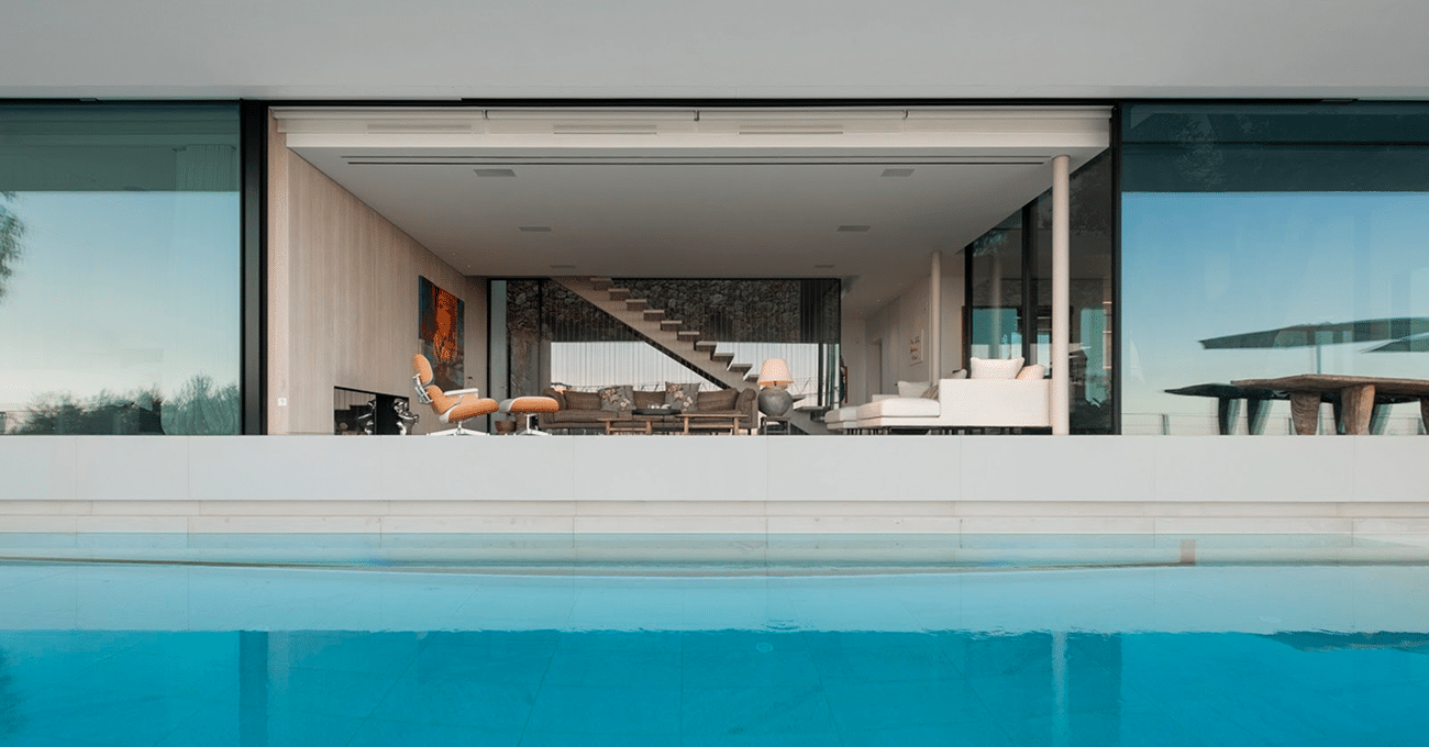 La vivienda se articula mediante volúmenes horizontales de líneas limpias y proporciones equilibradas. La fachada combina revestimientos pétreos claros con carpinterías minimalistas de gran formato, generando una imagen sofisticada y atemporal. Los cerramientos correderos de suelo a techo permiten una apertura total del salón hacia la terraza y la piscina, eliminando límites visuales y potenciando la entrada de luz natural durante todo el día. La arquitectura se concibe como un marco que enmarca el paisaje y maximiza la conexión con el exterior.