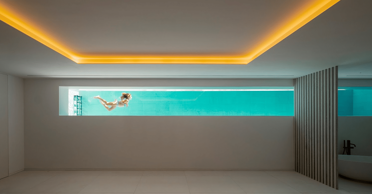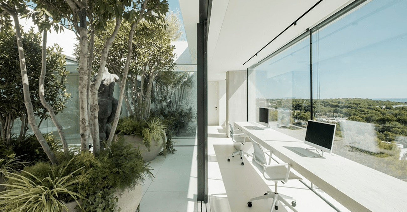La planta principal se organiza como un gran espacio abierto donde salón, comedor y cocina fluyen sin interrupciones. La escalera interior, ligera y elegante, se convierte en un elemento escultórico que conecta ambos niveles y aporta dinamismo al conjunto. La piscina longitudinal se sitúa paralela a la vivienda, reforzando la continuidad espacial y generando un efecto espejo que amplifica la sensación de amplitud y serenidad. Las terrazas y zonas lounge permiten disfrutar del clima mediterráneo y de la privacidad que caracteriza a las villas exclusivas en Portals.