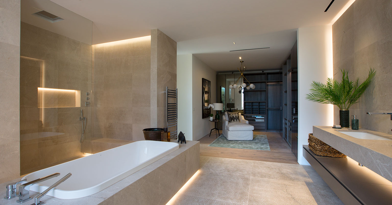 La selección de materiales responde a criterios de durabilidad, sofisticación y coherencia estética. Los pavimentos de gran formato en tonos neutros potencian la luminosidad interior, mientras que los revestimientos pétreos aportan textura y carácter mediterráneo. Las carpinterías de altas prestaciones garantizan aislamiento térmico y acústico, y los sistemas de climatización eficientes aseguran confort en cualquier estación. Cada elemento constructivo ha sido ejecutado con precisión, alineado con los más altos estándares de calidad en la construcción de villas de lujo en Palma.