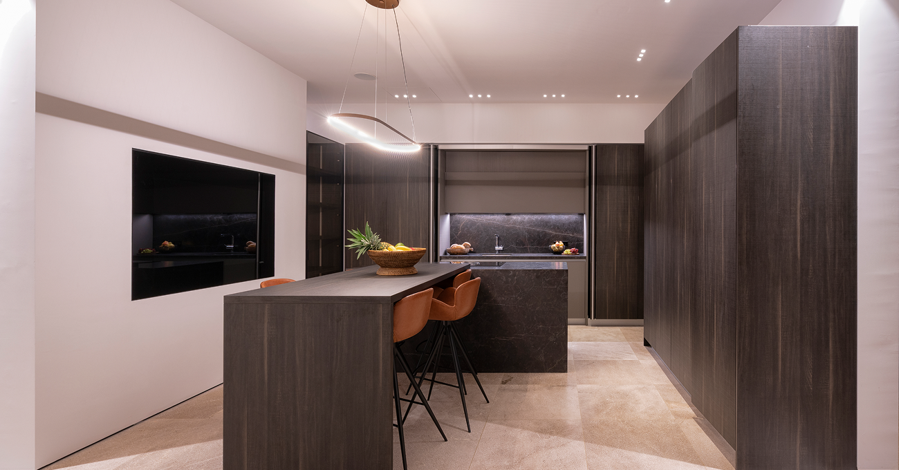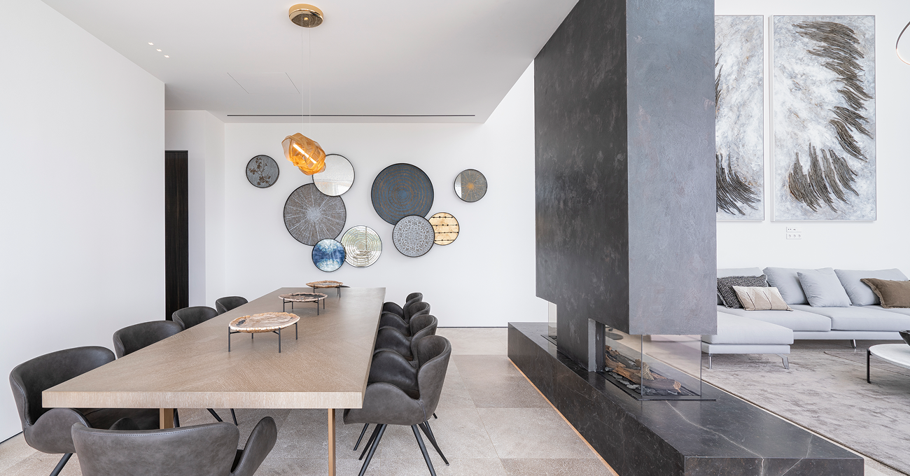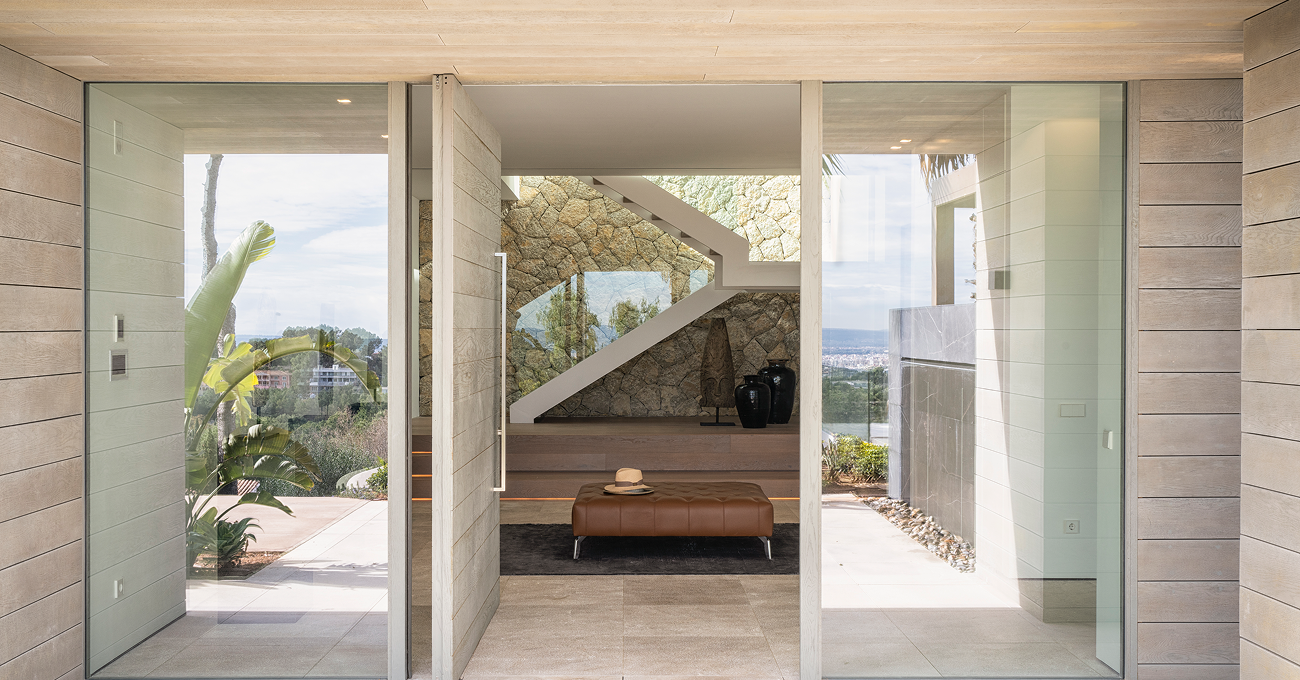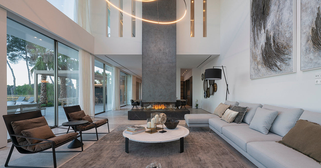 La arquitectura se define mediante una composición horizontal limpia y sofisticada, caracterizada por grandes superficies acristaladas que permiten la entrada constante de luz natural durante todo el día. La vivienda se concibe como un espacio amplio y diáfano, con una conexión fluida entre interior y exterior. La chimenea se integra como pieza escultórica y funcional dentro del salón principal, visible desde distintos ángulos y convirtiéndose en el corazón arquitectónico del proyecto. Este elemento refuerza la sensación de hogar dentro de una villa contemporánea de lujo en Palma.