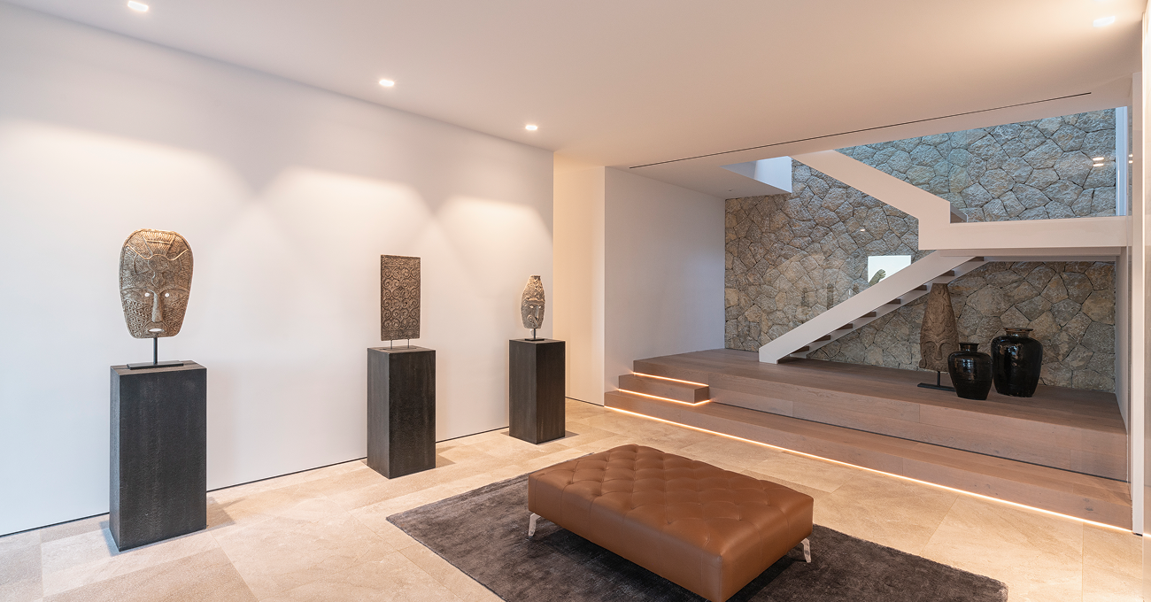La selección de materiales responde a criterios de sofisticación, durabilidad y atemporalidad. Revestimientos pétreos naturales aportan textura y solidez, mientras que pavimentos de gran formato en tonos neutros amplifican la luminosidad interior. Las carpinterías de altas prestaciones garantizan eficiencia térmica y acústica, y la iluminación integrada realza los materiales y la arquitectura. Cada detalle ha sido ejecutado con precisión, consolidando una villa exclusiva en Son Vida que combina diseño contemporáneo, confort y máxima calidad.