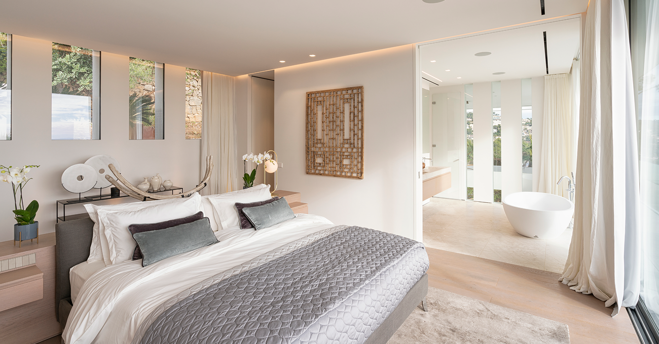 La planta principal se abre completamente hacia terrazas y piscina mediante carpinterías minimalistas de gran formato que eliminan barreras visuales. Salón, comedor y cocina se integran en un espacio continuo que potencia la amplitud y la armonía. Las dobles alturas y la iluminación arquitectónica cuidadosamente diseñada incrementan la percepción espacial y realzan los volúmenes. En el exterior, la piscina y las zonas de descanso forman parte de un conjunto coherente, diseñado para disfrutar del clima mediterráneo durante todo el año.